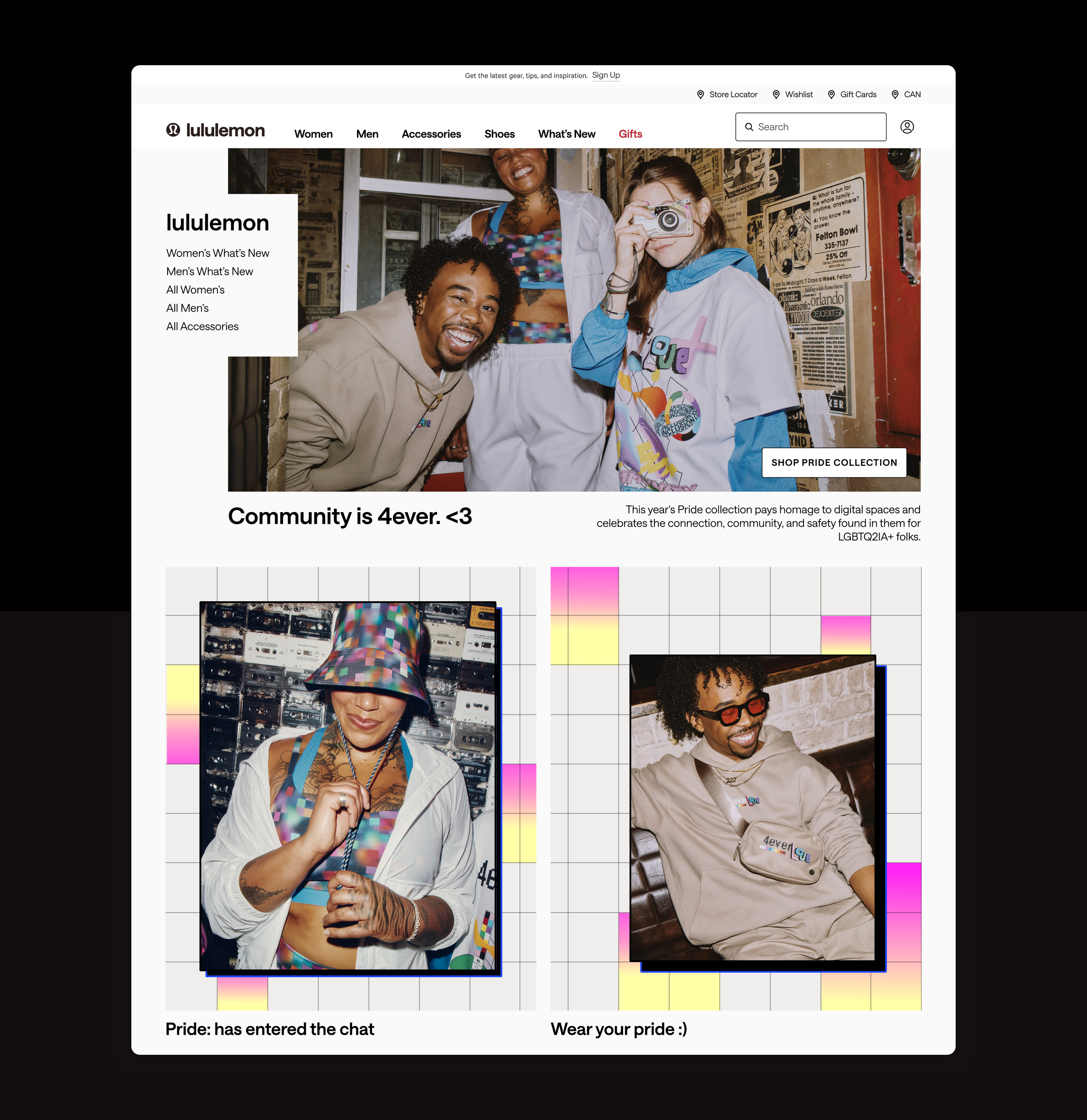 For lululemon’s Pride campaign, I partnered with product and marketing to create a concept inspired by early internet forums and 90s hangout spaces—places where LGBTQ2IA+ communities first found connection and belonging. Grounded in community insight and business goals, we developed the creative direction Ultra Nostalgia: a celebration of those safe spaces reimagined through a modern, joyful lens.